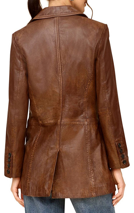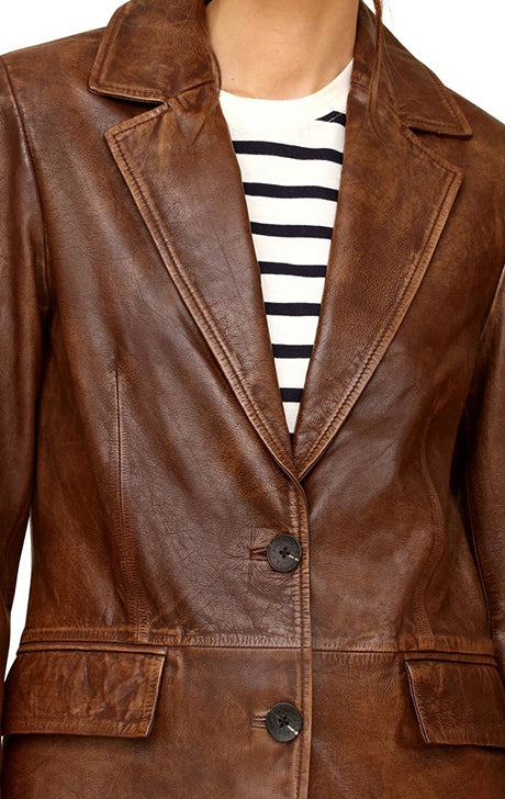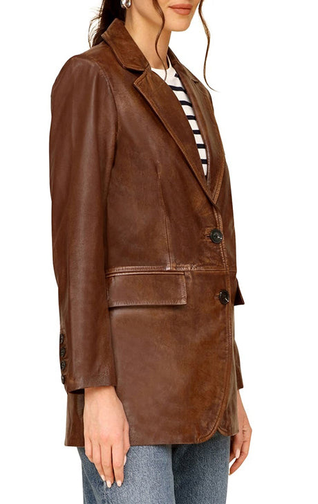 Step into timeless sophistication with this Women’s Brown Leather Blazer Jacket, designed to offer the perfect balance of elegance and modern edge. Crafted from high-quality genuine leather, this blazer-style jacket features a smooth, luxurious finish, structured tailoring, and a versatile two-button front closure that adds a polished touch to any outfit.