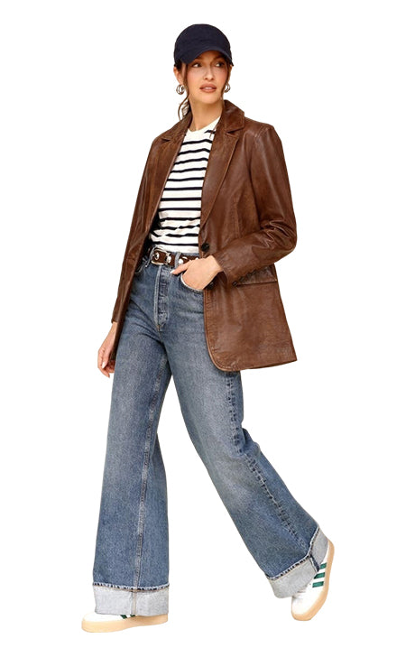 Designed for year-round wear, this women’s leather blazer is lightweight enough for layering during transitional weather while providing just the right amount of warmth for cool evenings. Over time, the premium leather develops a beautiful natural patina, giving it a unique character and ensuring it only looks better with age. Its structured fit flatters all body types, making it a versatile piece for both casual and semi-formal settings.