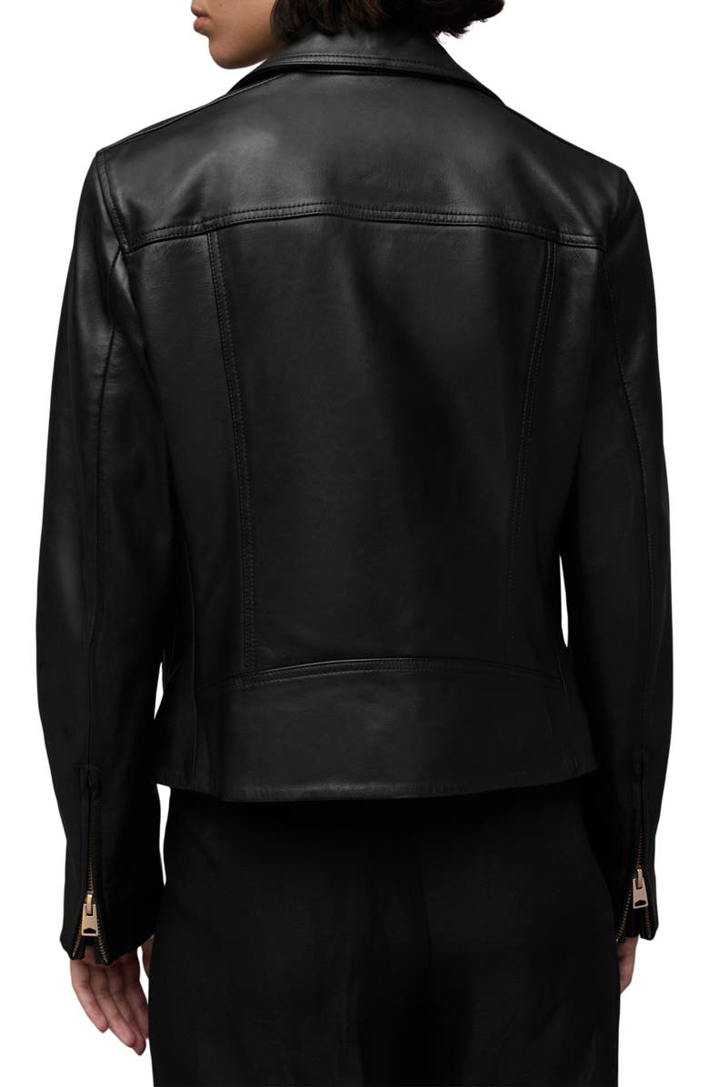 This Vela Leather Biker Jacket is made from buttery-soft lamb leather with clean lines and brassy goldtone zippers, perfect for stylish biker looks. It offers a timeless aesthetic and a comfortable, classic fit.