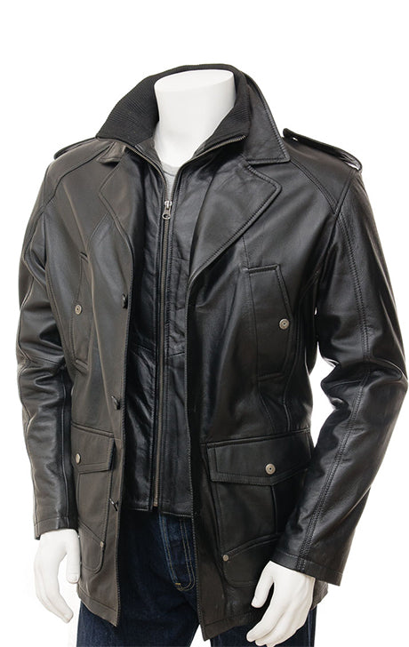 The Men’s High-Neck Black Leather Peacoat Jacket is a sophisticated blend of timeless design and rugged durability, making it an essential addition to any wardrobe. Crafted from premium genuine leather, this jacket offers a sleek look with versatile styling options. The high-neck collar and modern silhouette provide an effortlessly polished appearance, while practical features like multiple pockets and a comfortable inner lining make it suitable for all-day wear. Whether for a casual outing or a dressier occasion, this jacket ensures you stay both stylish and comfortable.