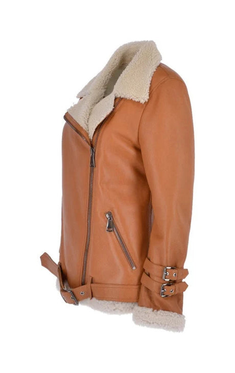Crafted from soft, luxurious shearling in a rich tan hue, this pilot jacket exceptional quality and craftsmanship. Handcrafted with precision using only the finest grades of sheepskin leather, it delivers style and substance. Designed to withstand harsh weather, this classic pilot biker jacket offers timeless appeal and a cozy touch to elevate your wardrobe