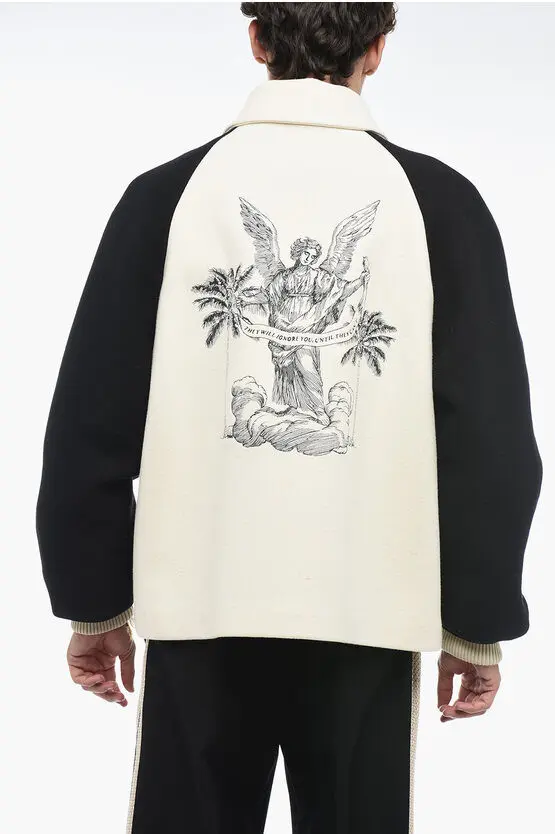 The Milan-based label offers a fresh take on varsity style with this contrast-sleeve wool jacket detailed with logo lettering and an angelic graphic at the back.